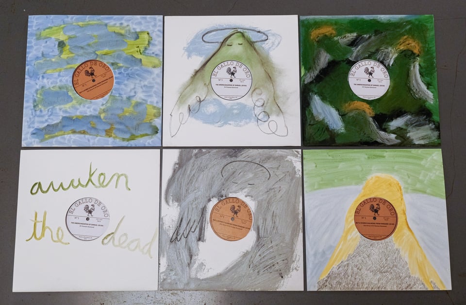 Every record sleeve has a unique 12 × 12 in. painting/drawing on both sides. They are done in oil, graphite, and charcoal on gessoed archival 350gsm paper. They came out really beautifully, with variations of angel motifs, along with wind, barracks, and fragments from Walter Benjamin. For the show I am making some wooden structures to display both sides of the records.