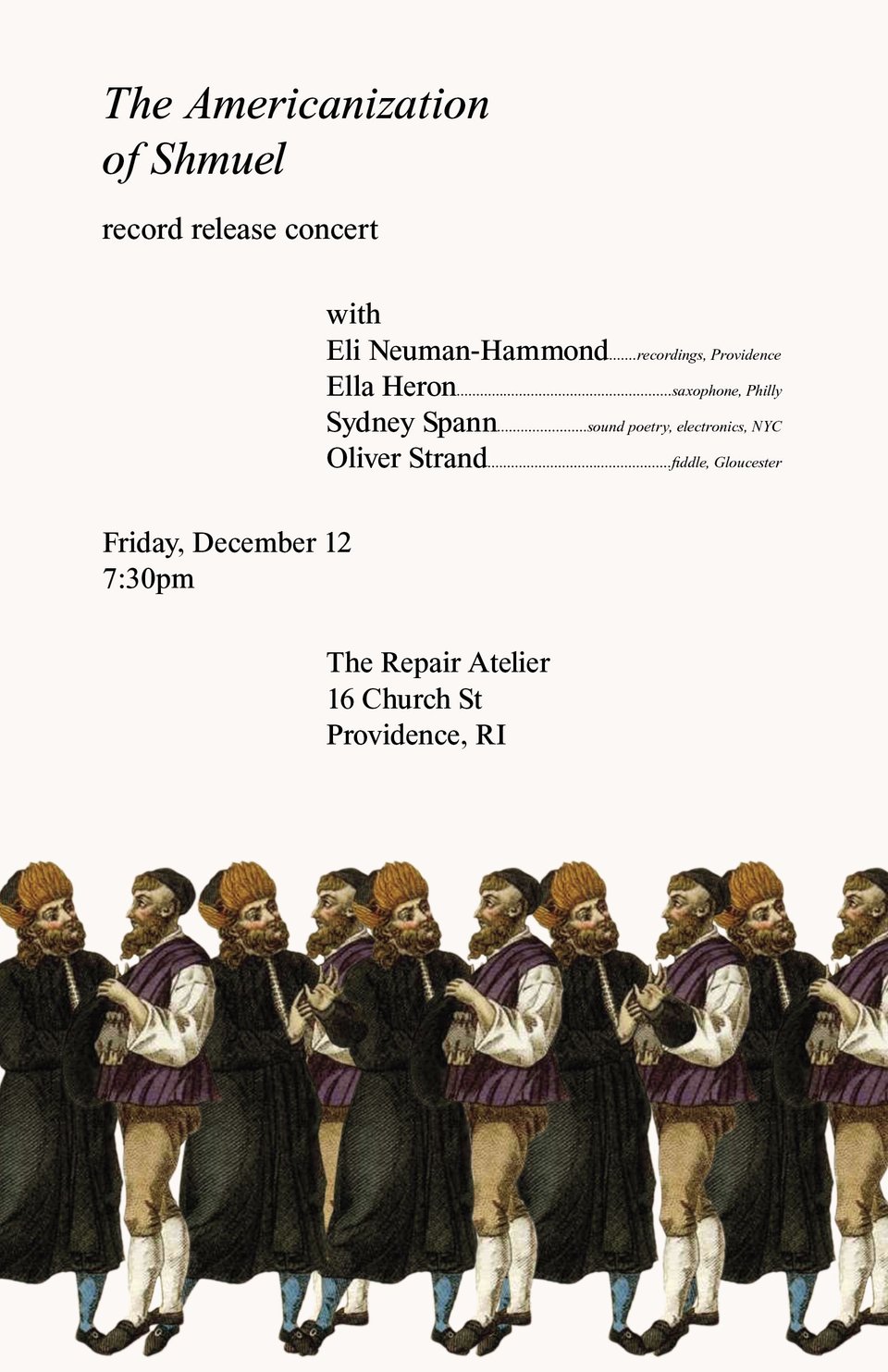 I hope to see you there!!! It’s Friday December 12, 7:30pm at the Repair Atelier on Church St, Providence. There will be a modest cover to support the out-of-town artists.